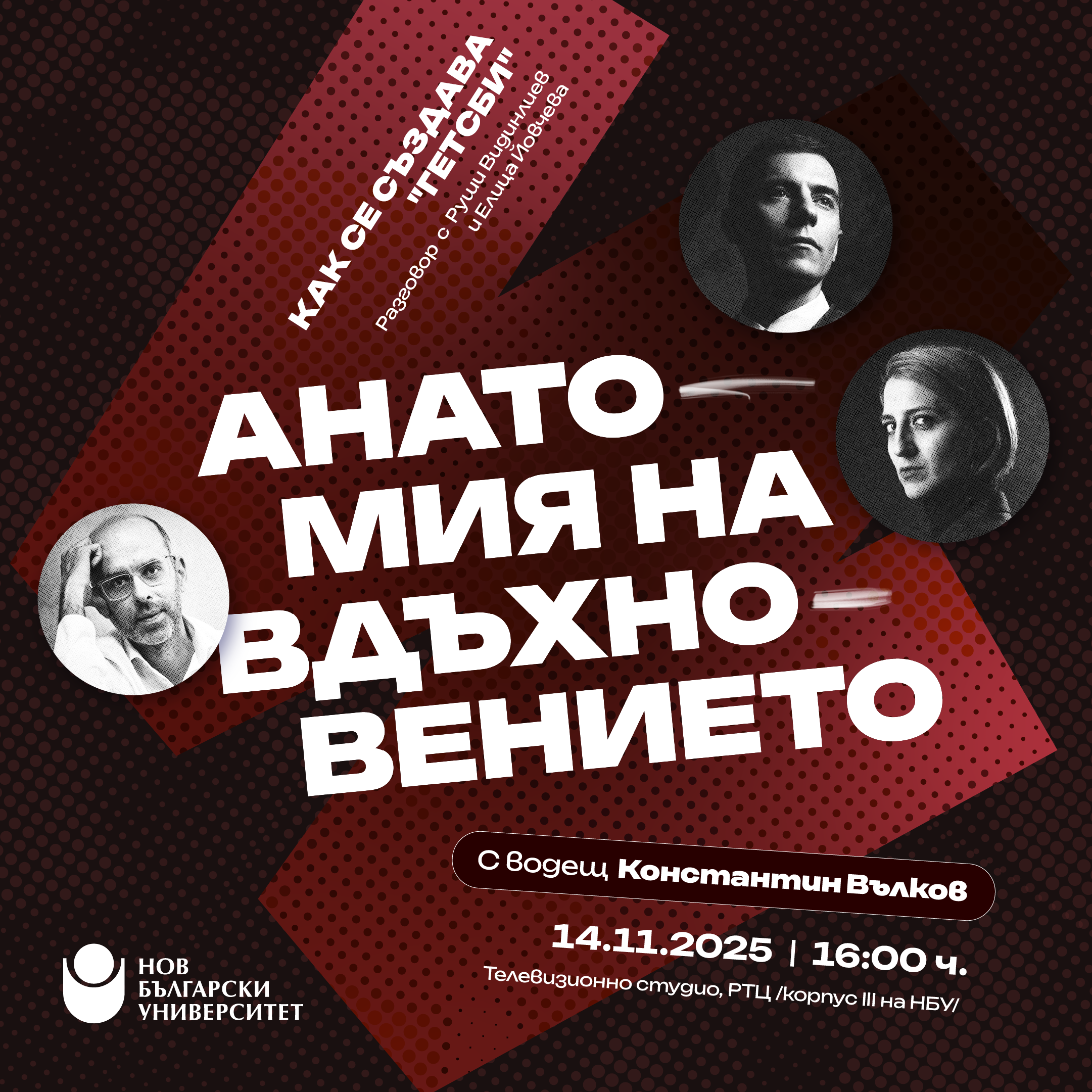 Събитието „Анатомия на вдъхновението“ има за цел да среща студентите на Нов български университет с успешни професионалисти от различни сфери на творчеството и бизнеса. Чрез открити разговори, презентации и визуални разходки гостите ще споделят своя опит и ще разкрият важни детайли от професионалния си път.