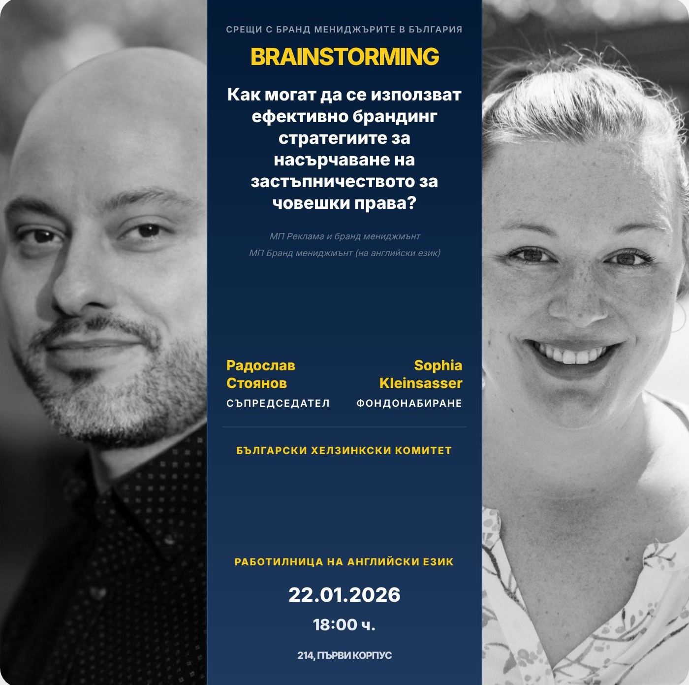 По време на работилницата София ще проведе сесия за мозъчна атака, в която нашите студенти ще работят върху генерирането на идеи как брандинг стратегиите могат да се използват ефективно за насърчаване на застъпничеството за човешките права: