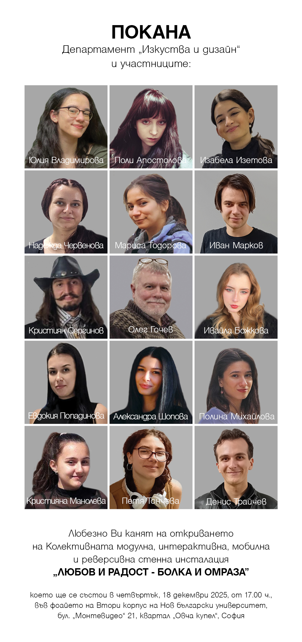 Автори на модулните панели са студенти от различни програми на департамент „Изкуства и дизайн”, изучаващи живописни и стенописни курсове: Александра Шопова, Дeнис Трайчев, Евдокия Попадинова, Иван Марков, Изабела Изетова, Ивайла Божкова, Кристиян Сергинов, Кристияна Манолева, Мариса Тодорова, Надежда Червенова, Петя Тончева, Поли Апостолова, Полина Михайлова и Юлия Владимирова.