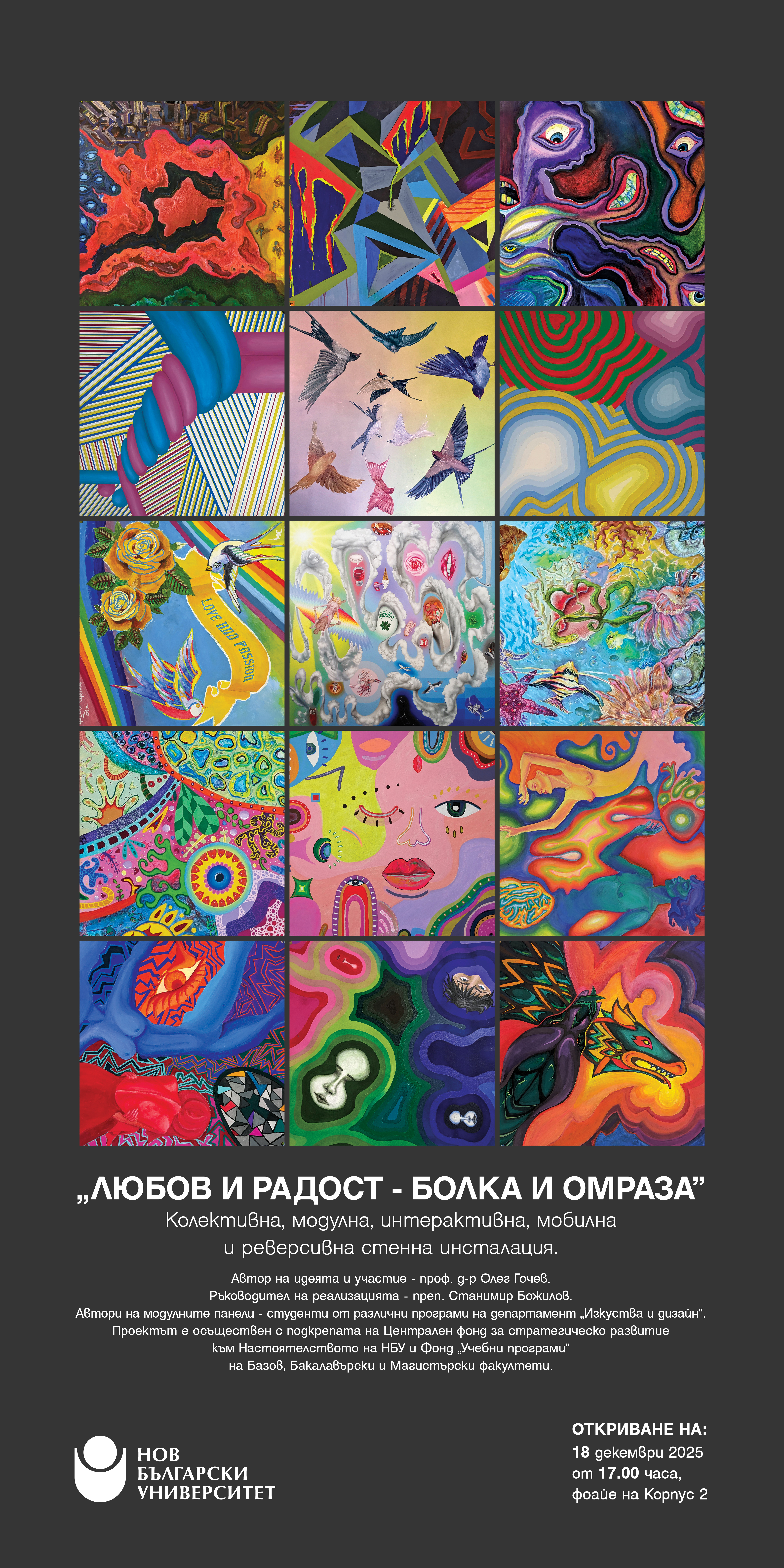 Проектът продължава концепцията на колективните мобилни стенни инсталации „Любов и омраза” от 2009 г. и „Дух и материя” от 2014 г., създадени в НБУ по идея, авторство и участие на проф. д-р Олег Гочев, под ръководството на цялостната им реализация и участие на Станимир Божилов. Модулните панели могат да се местят върху стената, да се въртят около центъра си и да се обръщат, тъй като са двустранно изписани. Сред основните цели на проекта е възможността за участие на публиката в творческия акт на интерпретиране на творбата, променяйки я в огромен брой варианти на структурни композиционни решения, различни цветови комбинации, съчетания и въздействия на двустранните изображения.