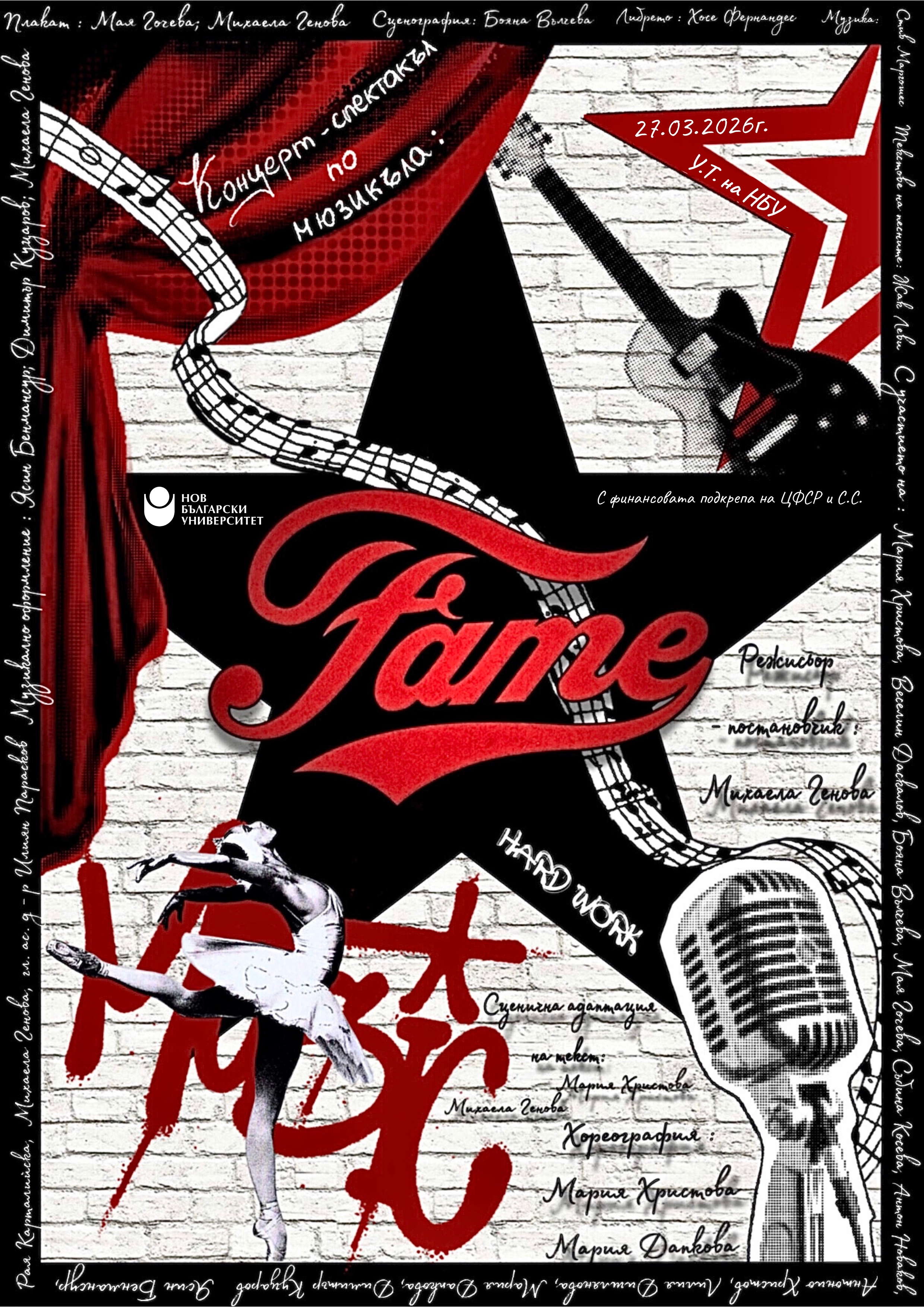 Концертното изпълнение на мюзикъла Fame е резултат от енергията и таланта на студентите от НБУ, с участието на гости от НМА. Проектът възниква естествено от стремежа им към сцена, а подготовката се превръща в пространство за вдъхновение и развитие.
