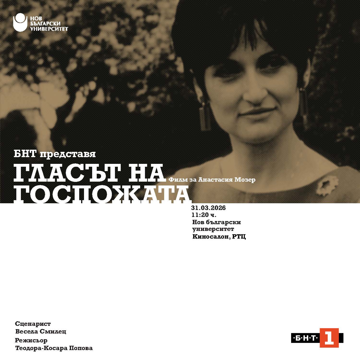 Филмът на БНТ „Гласът на госпожата“ представя историята на бурните дни на 90-те години на 20-и век, през призмата на живота и делото на госпожа Анастасия Мозер. Една дама застава начало на БЗНС и се опитва да обедини българските земеделци. За превратностите и начина на преодоляването им, за борбения характер и горчивината от предателствата говорят политически привърженици, партньори и опоненти на госпожа Мозер, както всички я наричат. От дистанцията на времето тя се връща назад към най-важните години от нейната политическа кариера, белязали и началото на българската демокрация.