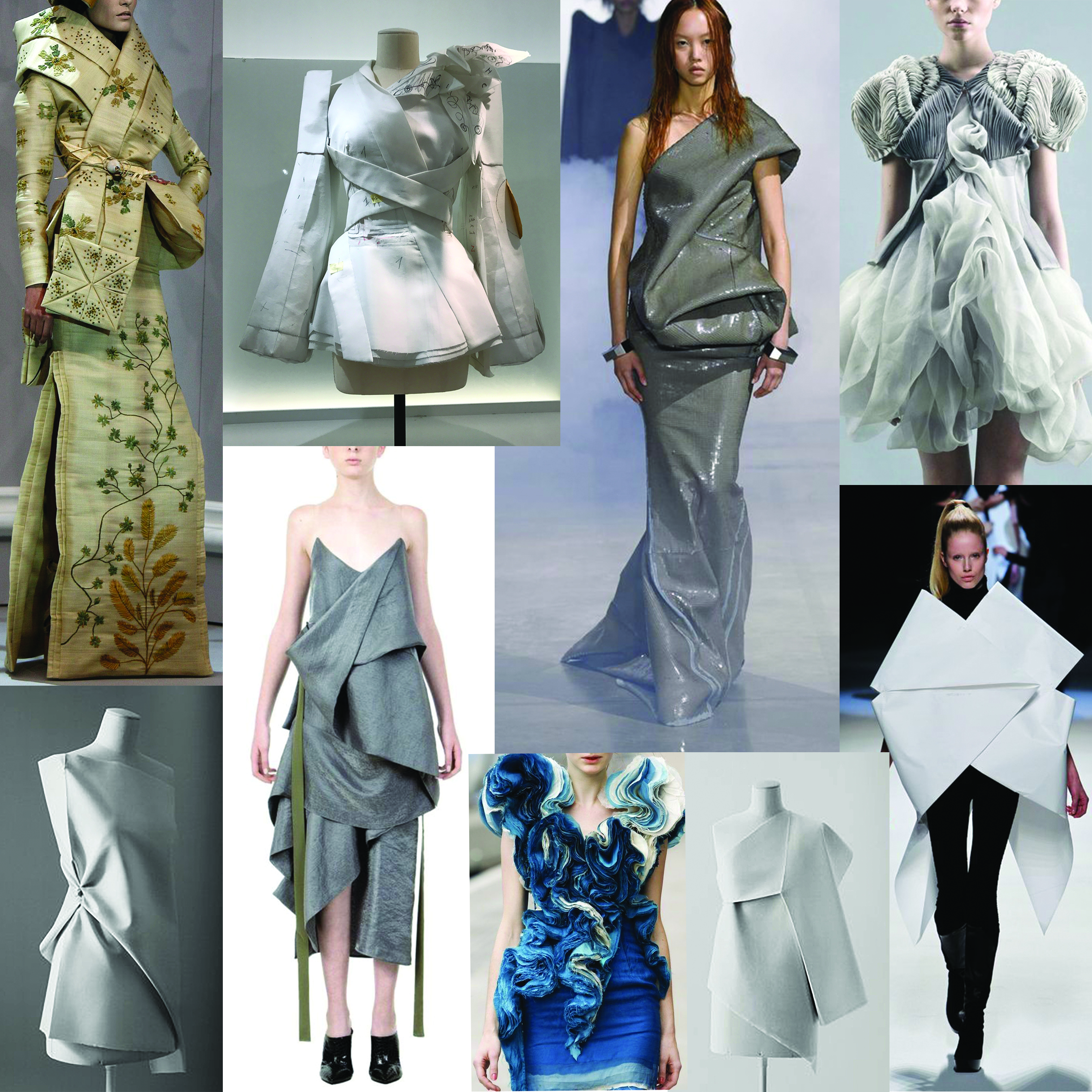 Лекцията разглежда обемното моделиране (мулаж) като креативен похват в модния дизайн. Представени са предимствата на този метод спрямо плоското конструиране и възможностите за експериментиране с форма, обем и пропорции за постигане на сложни силуети и комплексни конструктивни решения. Разглеждат се разнообразни похвати за прилагане на мулажната техника – от драпиране, плисиране и кроене по верев до деконструкция, органични форми и оригами, чрез които се реализира богат спектър от креативни дизайнерски идеи. Подчертава се възможността обемното моделиране да се прилага като средство за създаване на иновативни и художествени облекла с висока дизайнерска стойност.