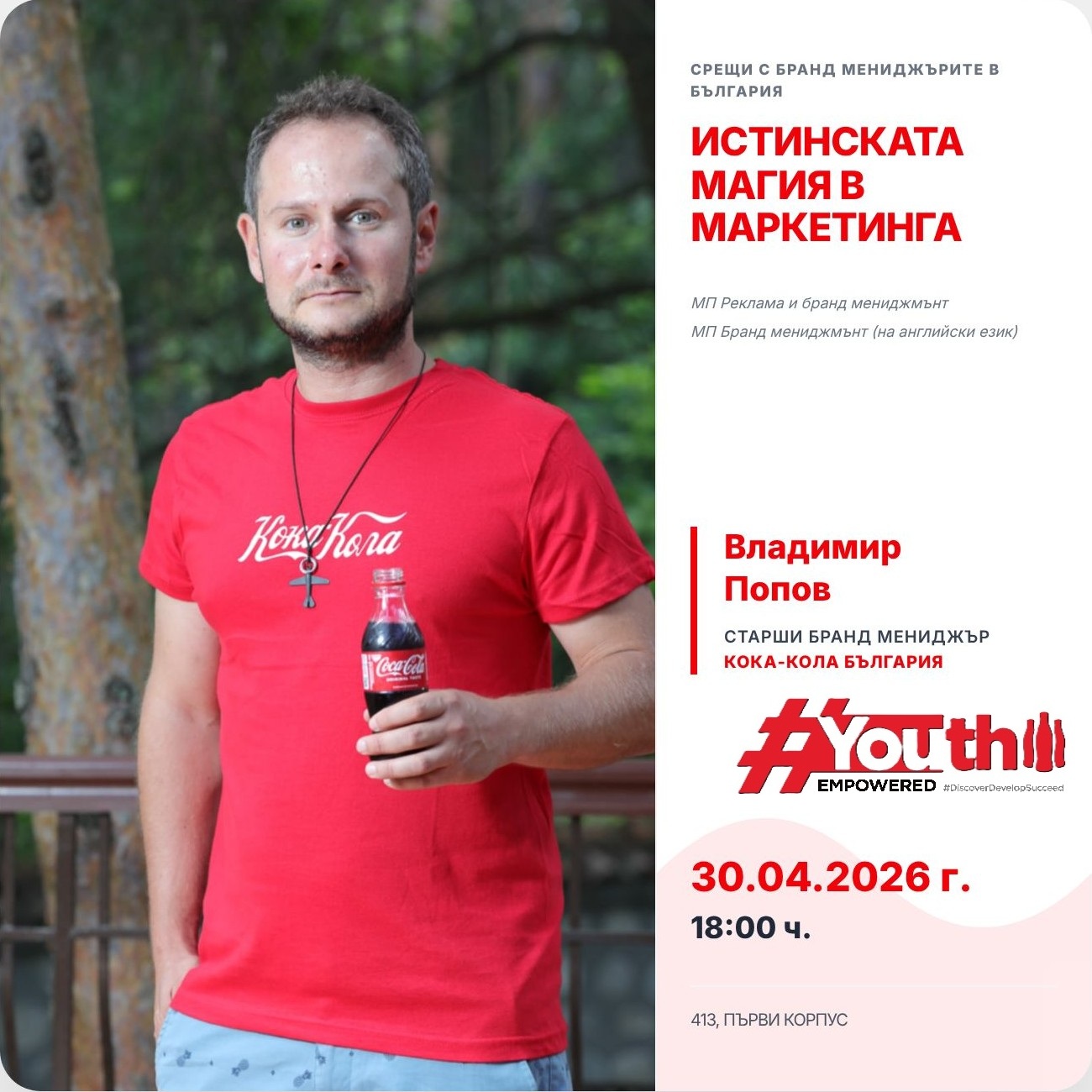 Владимир Попов е старши бранд мениджър в маркетинг екипа на Кока-Кола България, тясно занимаващ се с негазираните напитки от портфолиото на компанията. Владимир отговаря за разработване на стратегии за негазираните брандове като използва глобални планове и заедно с екипа ги приспособява за България. Това включва както дългосрочни планове за развитие на марките така и лансиране на нови продукти, ръководене на потребителски кампании и управляване на цялостната комуникационна стратегия на марките. Владимир е част от екипа на Кока-Кола България от 11 години, като в предните си роли е отговарял за брандовете Coca-Cola, Fanta, Sprite, Schweppes за България.