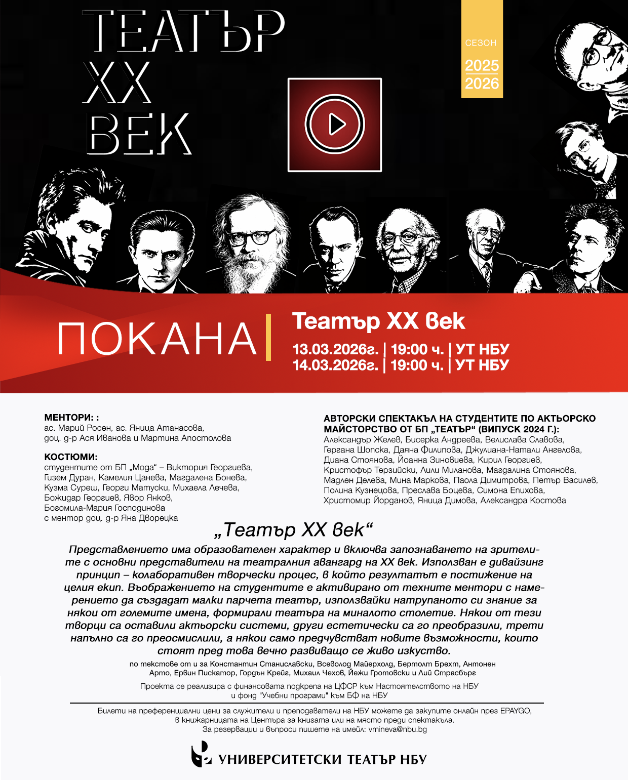 Авторски спектакъл на студентите по актьорско майсторство от БП „Театър“ (випуск 2024 г.) – Александър Желев, Бисерка Андреева, Велислава Славова, Гергана Шопска, Даяна Филипова, Джулиана-Натали Ангелова, Диана Стоянова, Йоанна Зиновиева, Кирил Георгиев, Кристофър Терзийски, Лили Миланова, Магдалина Стоянова, Мадлен Делева, Мина Маркова, Паола Димитрова, Петър Василев, Полина Кузнецова, Преслава Боцева, Симона Епихова, Христомир Йорданов, Яница Димова, Александра Костова
