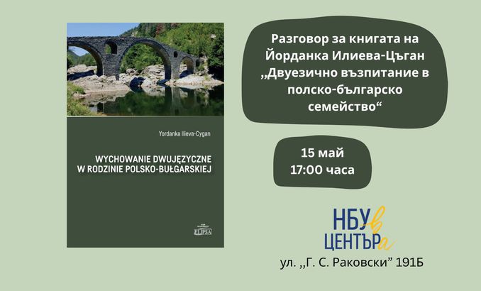 15 май, 17.00 ч., книжарница и галерия „НБУ в центъра“. Книгата „Двуезично възпитание в полско-българско семейство“ е с автор Йорданка Илиева-Цъган