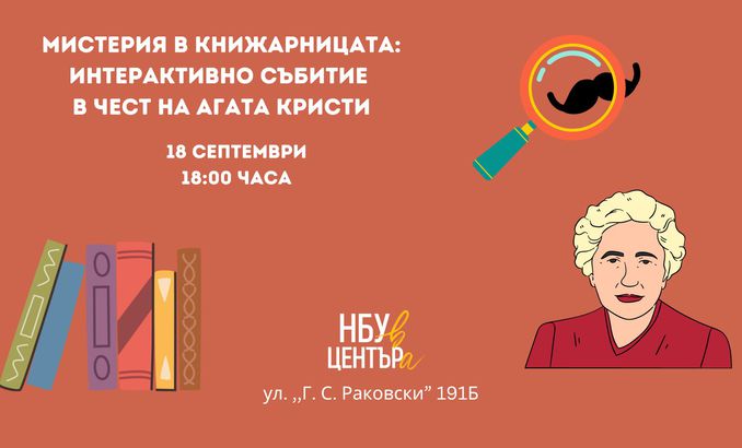 С вдъхновение от фестивала на Агата Кристи, който се провежда ежегодно през септември в град Торки, Англия, книжарница и галерия „НБУ в ЦЕНТЪРа“ Ви кани на интерактивно литературно събитие на 18. септември от 18.00 ч.
