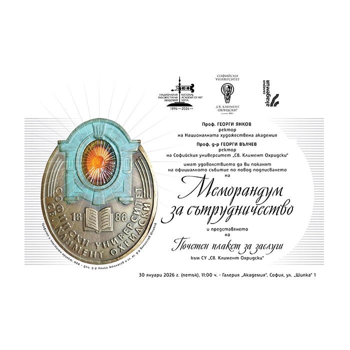 Начало В медиите В медиите 28 Януари 2026 Софийският университет „Свети Климент Охридски“ и Националната художествена академия подписват меморандум за сътрудничество БТА снимка: БТА Върни се към всички новини