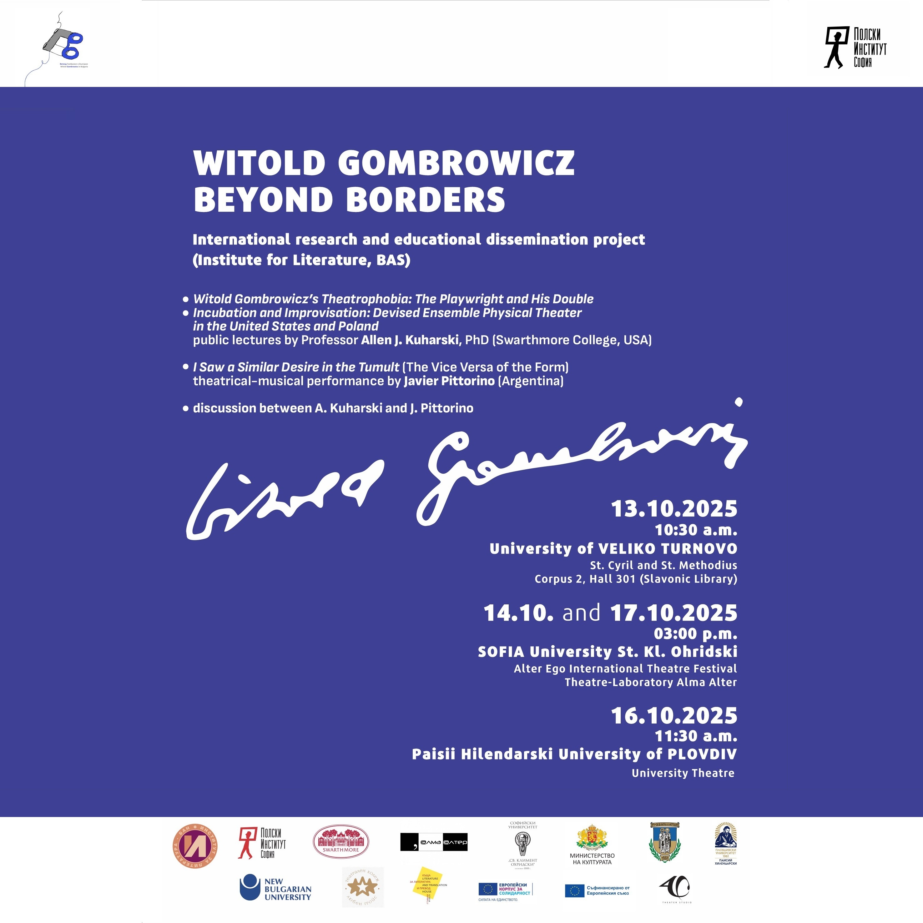Международен научен и културно-образователен проект „Витолд Гомбрович без граници“ (Институт за литература – БАН) е с подкрепата на Полския институт в София, СУ, ВТУ, ПУ, НБУ, Театрален колеж „Любен Гройс“, Къща за литература и превод