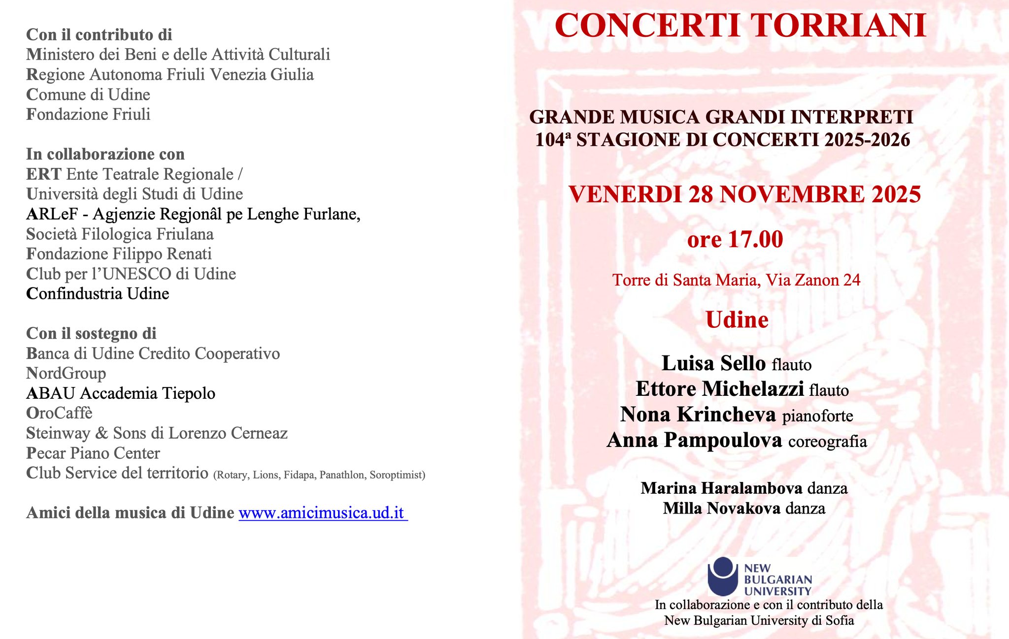 На 28 ноември 2025 г. в Кулата „Санта Мария“ в Удине се проведе концертът „Музикални преплитания и интриги“, част от 104-ия концертен сезон „Велика музика – Велики изпълнители“.