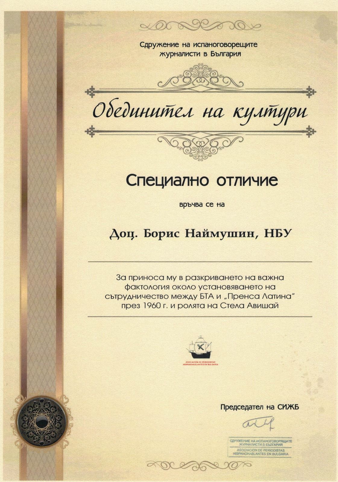 На 8 декември 2025 г. се състоя 13-ото издание на годишните награди на Сдружението на испаноговорещите журналисти в България (СИЖБ) „Светове и цветове“. В присъствието на дипломати, интелектуалци и журналисти, доц. Борис Наймушин беше удостоен с почетното отличие „Обединител на култури“.