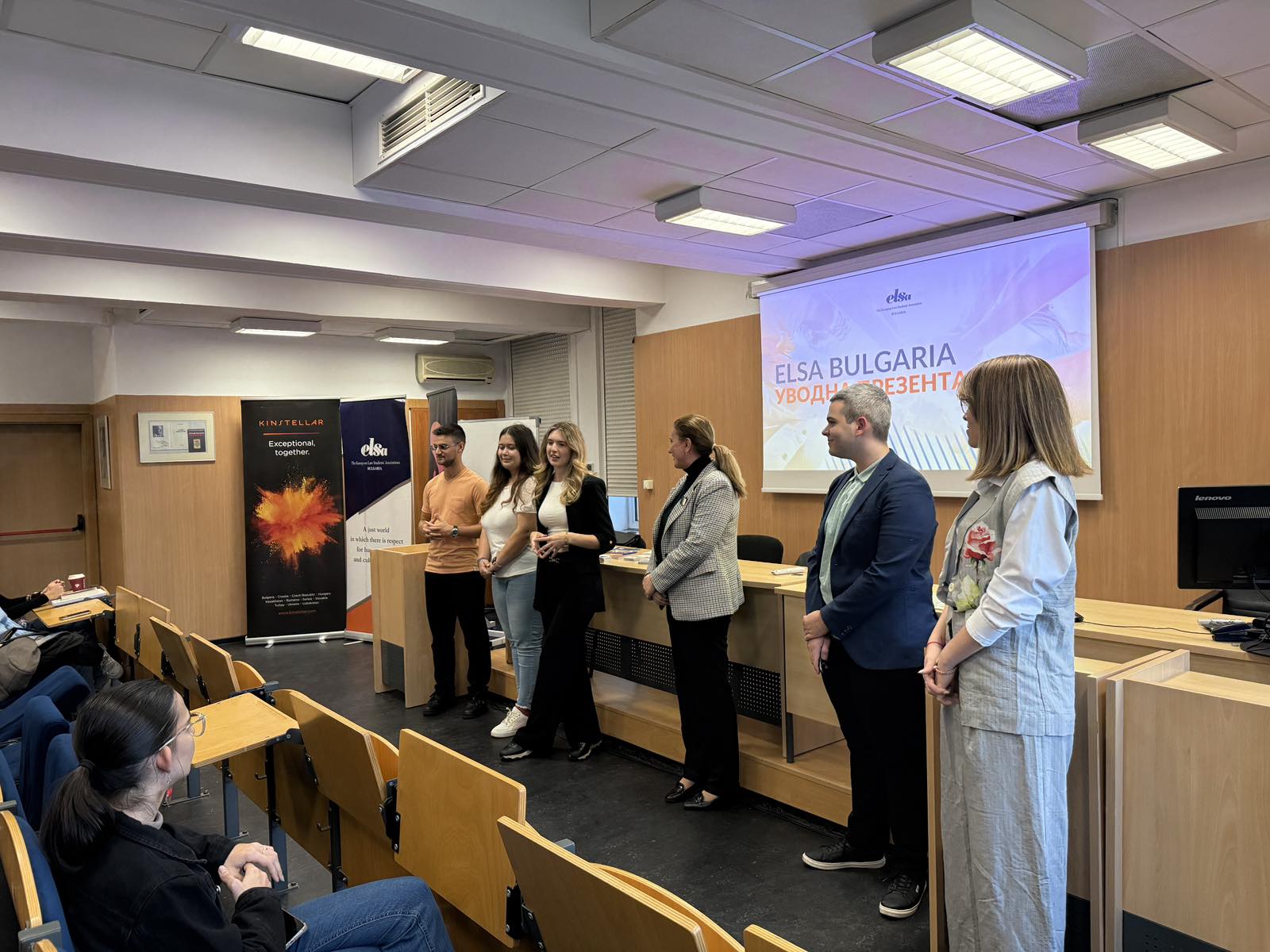На 9 октомври 2025 г. в Нов български университет се проведе представяне на Асоциацията на европейските студенти по право – ELSA България. Събитието беше организирано от  департамент "Право" и модерирано от доц. д-р Ралица Костадинова и ас.  Мартин Петров. Гост-лектори бяха представители на Управителния съвет на ELSA България:  Емили Стоянова – президент, Грета Костова – генерален секретар,  Станислав Георгиев – вицепрезидент „Маркетинг“, Ивана Янкова –  вицепрезидент „Национални стажове“ и Петър Генчев – вицепрезидент  „Семинари и конференции“. Те споделиха пред студентите от магистърска програма „Право“ мисията и  възможностите, които организацията предлага на бъдещите юристи, както и своя личен опит като активни членове на общността.