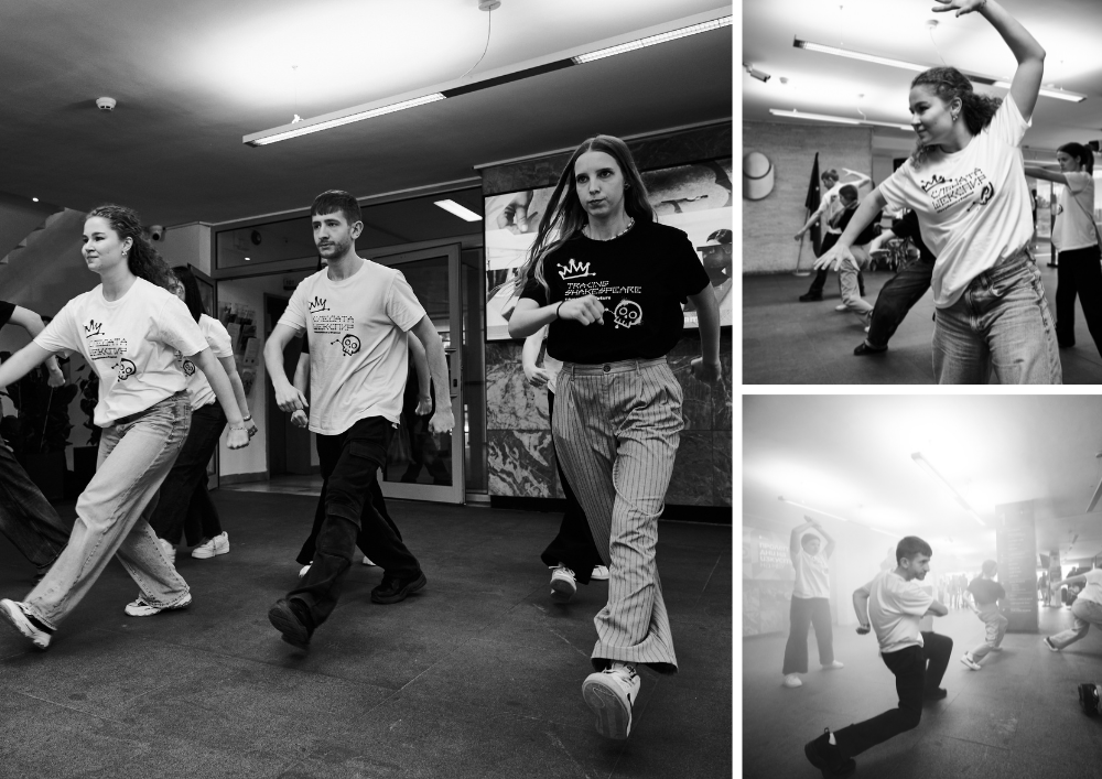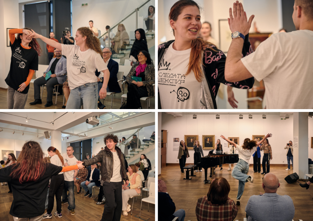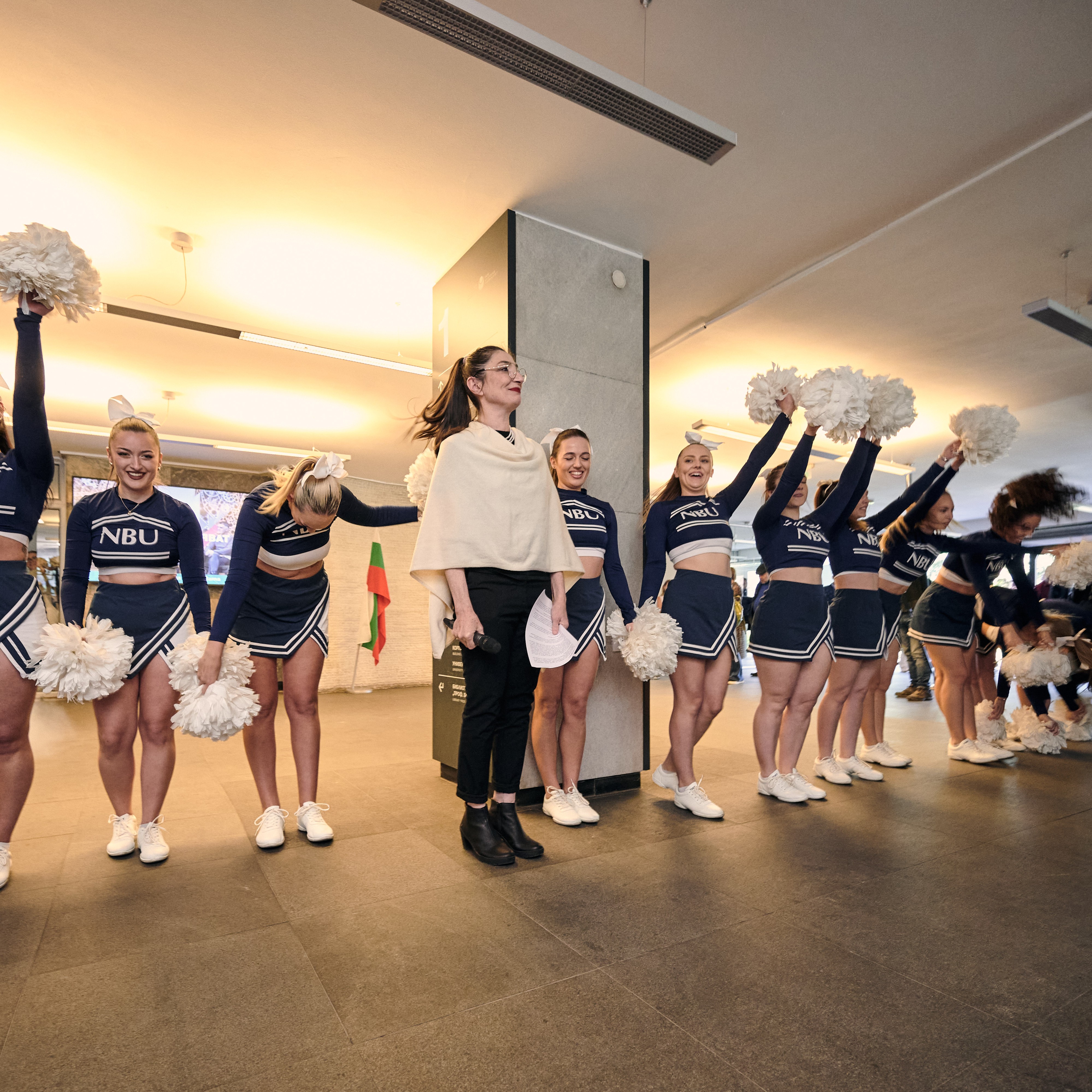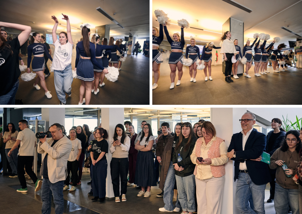 Поставихме началото с експлозивен пърформанс, в който студентите от департамент „Театър“ и мажоретният отбор на НБУ се изправиха в своеобразен артистичен „двубой“ на нетрадиционно пространство. Танцовото изпълнение на студентите по театър, вдъхновено от балета „Ромео и Жулиета“ по музика на Сергей Прокофиев, с хореография на Анна Пампулова, създаде силно емоционално внушение. То бе допълнено от динамичните и акробатични изпълнения на мажоретния отбор, воден от Виолета Глогова, които внесоха ритъм, енергия и зрелищност.