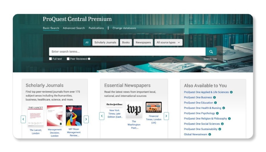 ProQuest Central Premium (1845 - ) – мултидисциплинарна и многоформатна база данни, предоставяща единно търсене в хиляди пълнотекстови периодични издания, вестници, аудио- и видеозаписи, доклади и други.