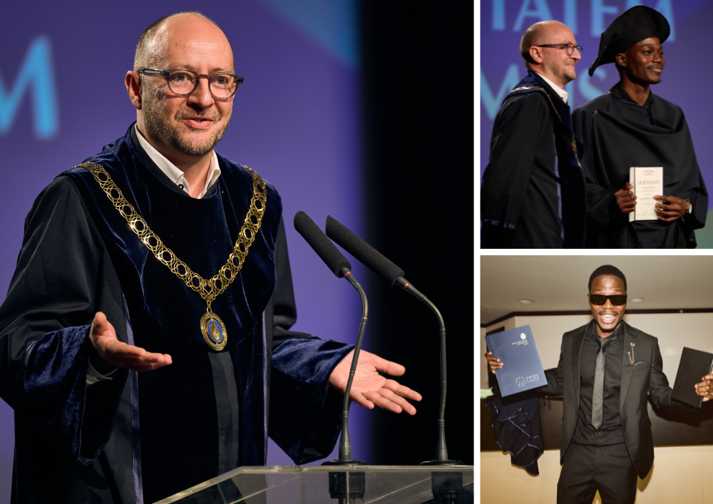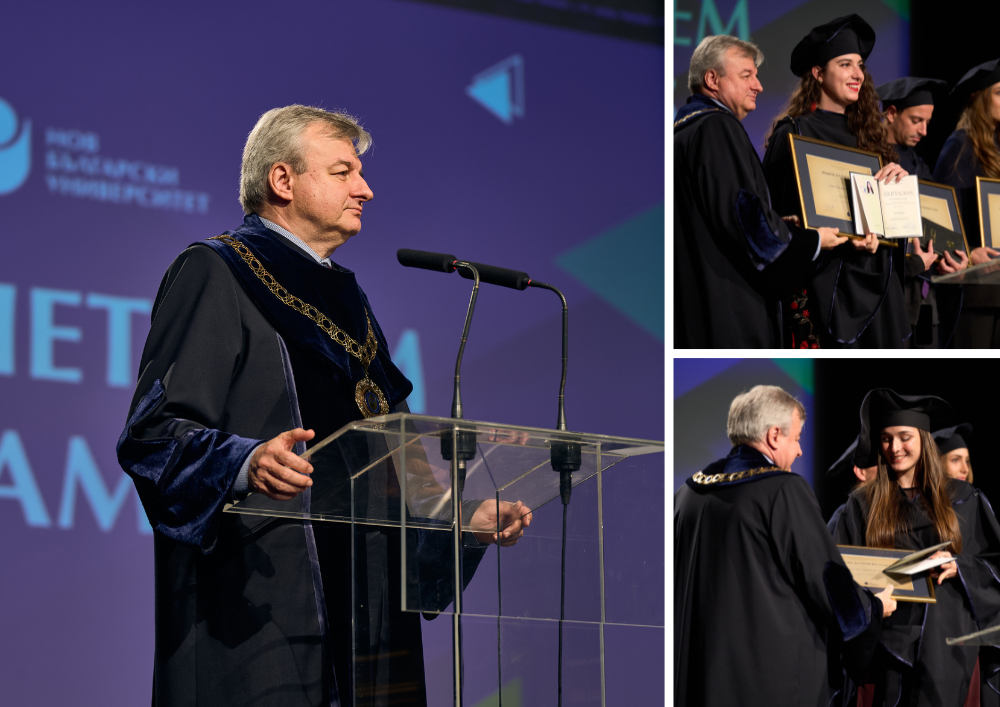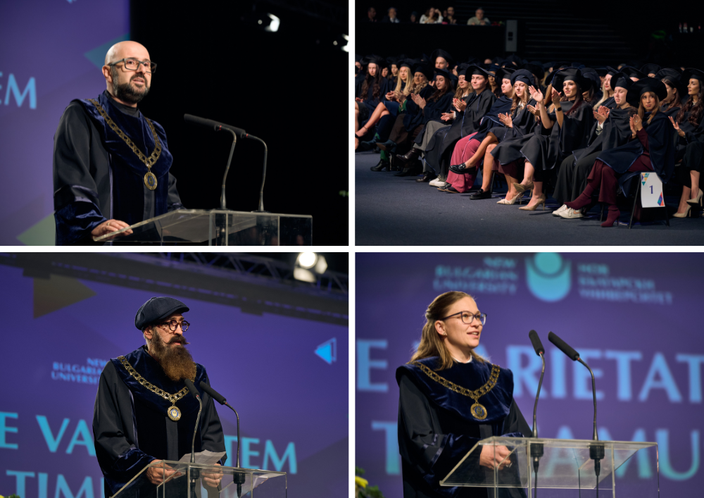 По традиция ректорът проф. Пламен Дойнов, д.н., поздрави дипломантите и връчи специални грамоти на 64 отличници: "Всички вие сте нашата ценност, нашата любов и да знаете, че Нов български университет винаги ще ви очаква да се завръщате в него, когато имате нужда... На добър час!"