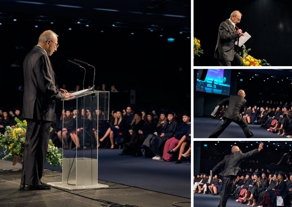 След речта си проф. Георгиев развърза вратовръзката си с логото на НБУ и я хвърли към дипломантите – символен жест на споделеност и съпричастност.