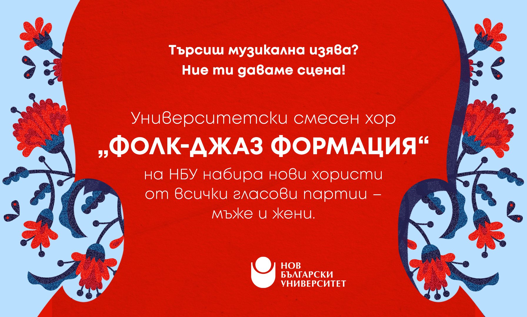 Университетският смесен хор „Фолк-джаз формация на НБУ“ кани студенти, преподаватели и служители, които обичат да пеят и имат желание да развиват своя талант, да станат част от нашата музикална общност. Участниците ще имат възможност да изразят себе си чрез музика, да се докоснат до разнообразен репертоар и да бъдат част от едно вдъхновяващо колективно преживяване.
