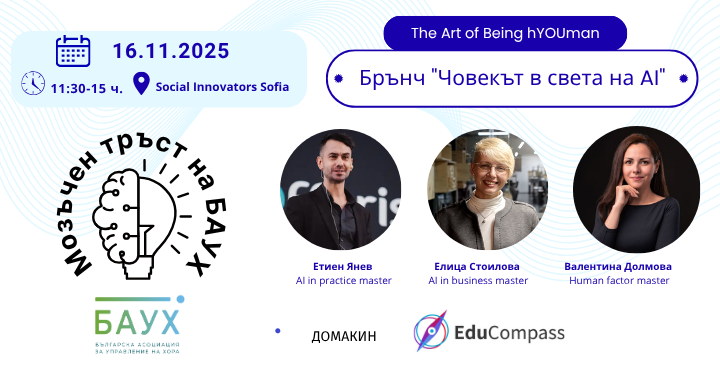 На 16 ноември 2025 студенти от магистърските програми „Мениджмънт за организационно съвършенство“ и „Управление и развитие на човешките ресурси“ под ръководството на доц. д-р Мария Иванова, взеха активно участие в брънч събитието „The Art of Being hYOUman – Човекът в света на изкуствения интелект". Това събитие не е обикновена лекция. Това е пространство за разговори, идеи и хора, които заедно създават полезни практики.