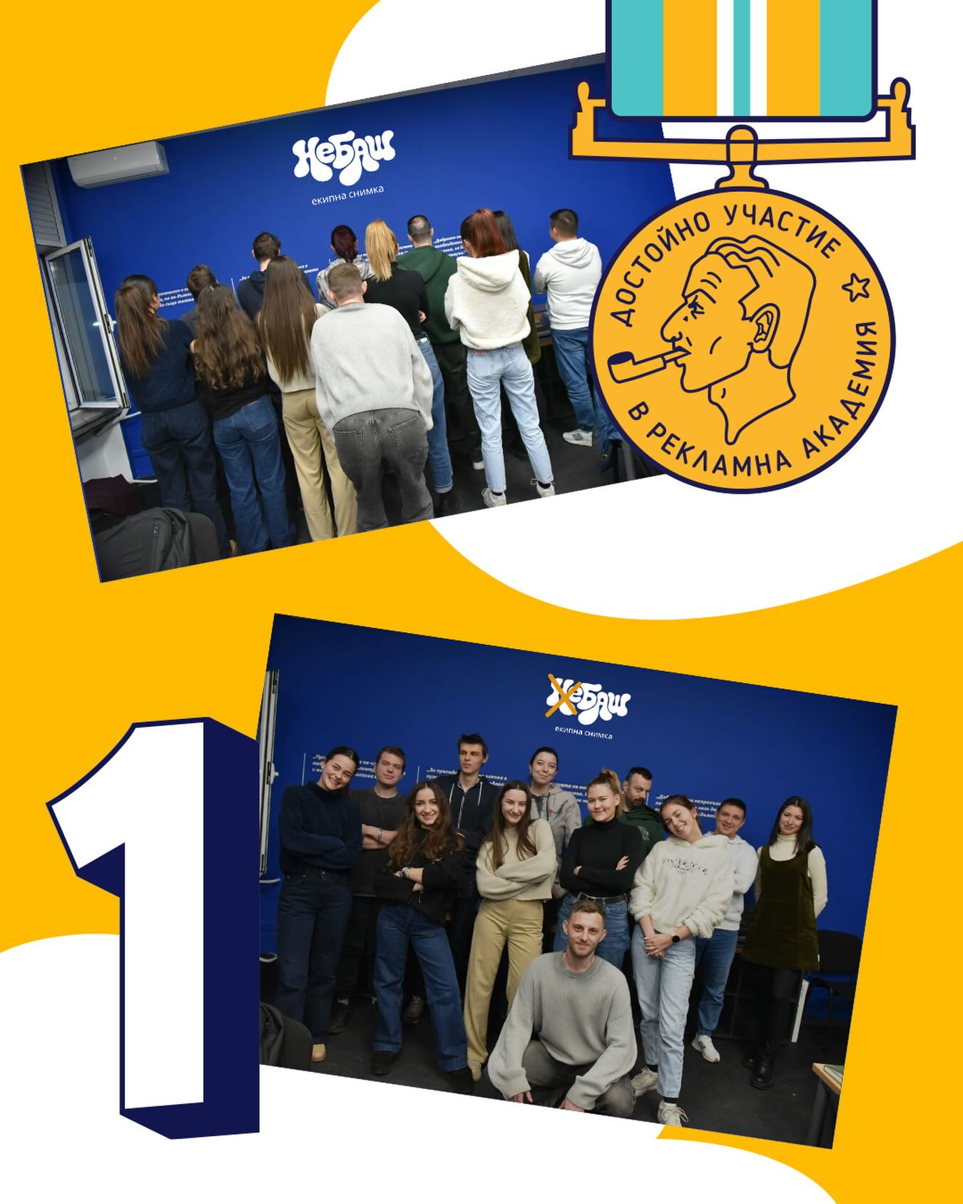 Големият победител в тазгодишната „Рекламна академия“ е Отбор 5, сектор „Бира“, със своя проект „НЕ БАШ“. Ментори на екипа бяха Десислава Маринова (Brand Manager „Бургаско“, „Каменица“ АД), Николай Диевски (Head of Strategy, proof.), Виктор Манчев (творчески директор, All Channels Group) и Димитър Тренчев (Head of Digital Media, UM Bulgaria).